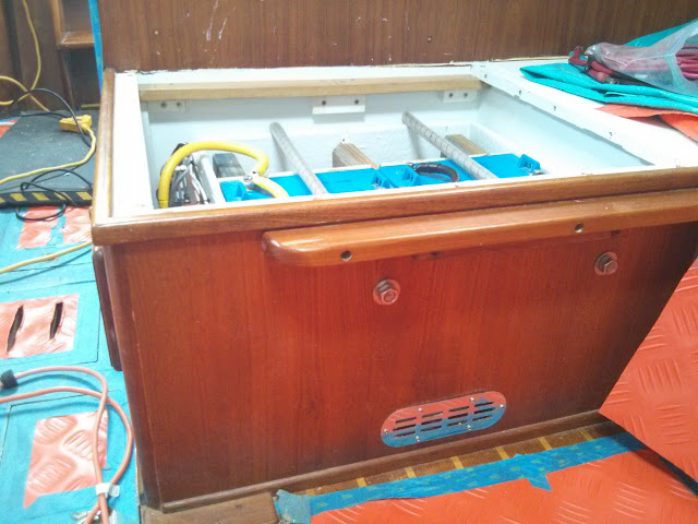 Early on in our refit we chose to eliminate the M382’s quarterberth in favor of additional storage space. Eliminating the berth allowed us to create a seat back at the nav station. The middle two panels of the seat back are removable. The outboard seat back panel is fixed. We installed the negative bus on the fixed vertical seat back panel and the positive fuse block / bus opposite along the original nav station structure.